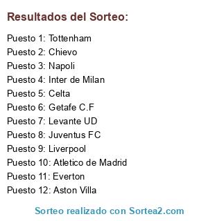 Lista de participantes: Juventus FC, Inter de Milan, Napoli, Chievo, Everton, Tottenham, Liverpool, Aston Villa, Levante UD, Getafe C.F, Celta, Atletico de Madrid.