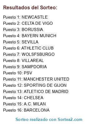 Lista de participantes: ATHLETIC CLUB, ATLETICO DE MADRID, BARCELONA, BAYERN MUNICH, VILLAREAL, BORUSSIA, CELTA DE VIGO, CHELSEA, MANCHESTER UNITED, A.C. MILAN, NEWCASTLE, PSV, SAMPDORIA, SEVILLA, SPORTING DE GIJON, WOLSFSBURGO.