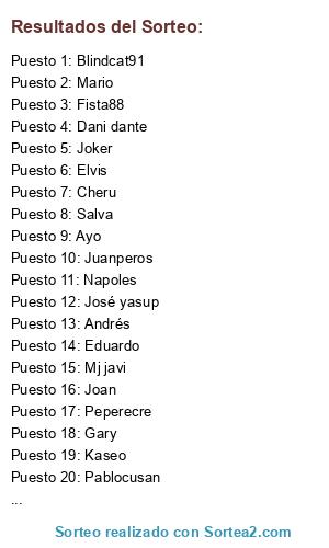 Lista de participantes: Isac ( algeciras), Juanperos (lazio), Juan vega ( shalke 04), Blindcat91 ( badajoz), Yukopollu ( levante), Muñones ( oporto), Avila ( malaga), Andrés ( lion), Mj javi ( zenit), Juan ( celta), Selinichev ( alaves), Garry ( girona).