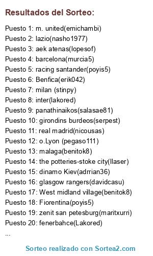 Lista de participantes: Tenerife(otazo1075), Benfica(erik042), the potteries-stoke city(llaser), wearside-sunderland(ruchi17), Marsella(mazinger2008), genoa(javigalvan), zenit san petesburg(maritxurri), besiktas(beto-einsha), girondins burdeos(serpest), glasgow rangers(davidcasu), dinamo Kiev(adrrian36), panathinaikos(salasae81), fenerbahce(Lakored), oporto(beivi98), aek atenas(lopesof), sporting lisboa(stinpy), o.Lyon (pegaso111), ajax(patrickmarquez), West midland village(benitok8), arsenal(danijugon11), m. united(emichambi), chelsea(pelavivo), racing santander(poyis5), real madrid(nicousas), sevilla(danijugon11), malaga(benitok8), barcelona(murcia5), Fiorentina(poyis5), inter(lakored), juventus(lopesof), milan (stinpy), lazio(nasho1977).