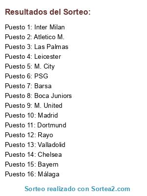 Lista de participantes: M. United, Valladolid, Bayern, Rayo, Boca Juniors, Dortmund, Inter Milan, Atletico M., Las Palmas, PSG, Barsa, Chelsea, Madrid, M. City, Leicester, Málaga.