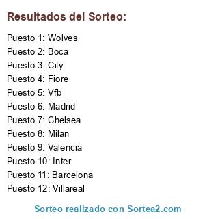 Lista de participantes: Inter, Villareal, City, Boca, Vfb, Wolves, Milan, Barcelona, Fiore, Chelsea, Valencia, Madrid.