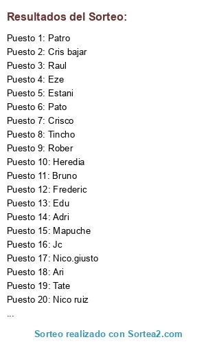 Lista de participantes: Patro, Adri, Bruno, Burri, Caito, Crisco, Dario, Diego, Eduardo, Estani, Eze, Fede Res., Fede Suarez, Frederic, Heredia, Jose, Juampy, Julian, Rober, Lucho, Nico ruiz, Pablo Reg., Pablo cba, Pato, Pope, Raul, Tonga, Rodrigo, Sebas, Tate, Tincho, Nico giusto.