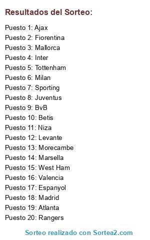 Lista de participantes: Morecambe, BvB, Atlanta, Sporting, Niza, Levante, Rangers, Juventus, Fiorentina, Inter, Milan, Tottenham, Madrid, Betis, Valencia, Espanyol, West Ham, Ajax, Marsella, Mallorca.