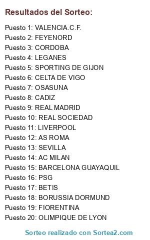 Lista de participantes: AC MILAN, AS ROMA, BARCELONA GUAYAQUIL, BETIS, BORUSSIA DORMUND, CADIZ, CELTA DE VIGO, CORDOBA, FEYENORD, FIORENTINA, LEGANES, LIVERPOOL, OLIMPIQUE DE LYON, OSASUNA, PSG, REAL MADRID, REAL SOCIEDAD, SEVILLA, SPORTING DE GIJON, VALENCIA.C.F..
