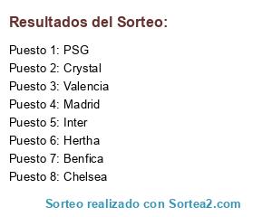 Lista de participantes: Valencia, Benfica, Madrid, Chelsea, Inter, Crystal, PSG, Hertha.