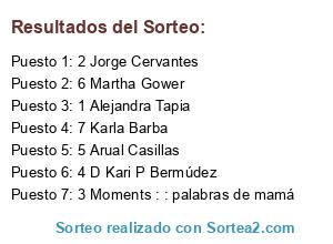 Lista de participantes: 1 Alejandra Tapia, 2 Jorge Cervantes, 3 Moments : : palabras de mamá, 4 D Kari P Bermúdez, 5 Arual Casillas, 6 Martha Gower, 7 Karla Barba.