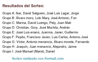 Lista de participantes: Gory, Daniel, Álvaro morete, Pepito, Christian, Guillermo, Francisco Javier, Marina, Álvaro moro, Juan Mati, Iker, Luis Carlos, Alejandro, Jorge, Andrés, José Luis Lagar, José Manuel (Mané), José Luis enano, Lolo Mary, Fon, Juanma, Fernando, David Salguero, José Antonio, Pety, Joaquín, David Luengo, Jaime, José Mochila, Antonio menancio, Juan menancio, Antonio José, Víctor.