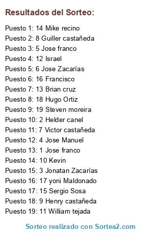 Lista de participantes: 1 Jose franco, 2 Helder canel, 3 Jonatan Zacarías, 4 Jose Manuel, 5 Jose franco, 6 Jose Zacarías, 7 Victor castañeda, 8 Guiller castañeda, 9 Henry castañeda, 10 Kevin, 11 William tejada, 12 Israel, 13 Brian cruz, 14 Mike recino, 15 Sergio Sosa, 16 Francisco, 17 yoni Maldonado, 18 Hugo Ortiz, 19 Steven moreira.