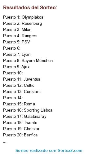 Lista de participantes: Real Madrid, Barcelona, Valencia, Atlético Madrid, Manchester Ud., Manchester City, Arsenal, Chelsea, Juventus, Inter, Milan, Roma, Lyon, PSG, Marsella, Sporting Lisboa, Oporto, Benfica, Bayern München, Celtic, Rangers, Galatasaray, Constanti, Dynamo de Kiev, Panatinaikos, Olympiakos, PSV, Ajax, Twente, Copenhaghe, Rosenborg, Bruxellles.