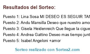- Puesto 1: Lina Sosa MI DESEO ES SEGUIR TAN ENAMORADA O TE DIRIA MAS KE EL DIA KE LO CONOCI Y TERMINAR NUESTA VIDA JUNTITOS Y MAS ENAMORADOS QUE HOY ESTOY HABLANDO DEL AMOR DE MI VIDA QUE ES MI MARIDO