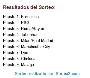 Lista de participantes: Chelsea, Lyon, Malaga, Manchester City, PSG, Tottenham, Barcelona, Roma/Bayern, Milan/Real Madrid.