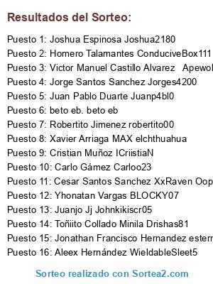 Lista de participantes: Yhonatan Vargas BLOCKY07, Jonathan Francisco Hernandez estermineitor07, Aleex Hernández WieldableSleet5, Xavier Arriaga MAX elchthuahua, Joshua Espinosa Joshua2180, Homero Talamantes ConduciveBox111, Robertito Jimenez robertito00, Juanjo Jj Johnkikiscr05, Victor Manuel Castillo Alvarez Apewolf81, Carlo Gámez Carloo23, Toñiito Collado Minila Drishas81, beto eb. beto eb, Cesar Santos Sanchez XxRaven OopsxX, Jorge Santos Sanchez Jorges4200, Cristian Muñoz ICriistiaN, Juan Pablo Duarte Juanp4bl0.