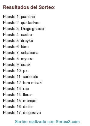 Lista de participantes: Diegoignacio, sebapona, llerar, juancho, carlototo, tom misaki, px, libre, quicksilver, myers, diegosilva, castro, didier, dreyko, rap, monipo, crack.