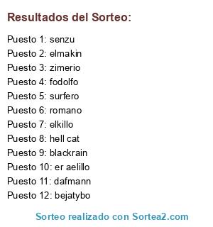 Lista de participantes: fodolfo, dafmann, elkillo, er aelillo, elmakin, surfero, blackrain, zimerio, hell cat, senzu, bejatybo, romano.
