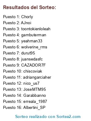 Lista de participantes: wolverine_rms, juansedasfc, erreala_1987, JoseMTM95, toontokienloleah, durut95, Garabbanno, adriangarciaher, chiscoviak, AJnoi, CAZADOR7F, gambuterman, yeahman33, nico_us7, Albertini_SP, Chorly.