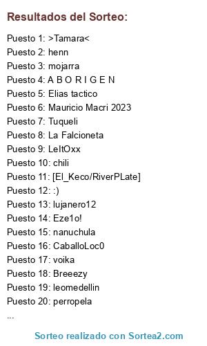 Lista de participantes: LeItOxx (56), Breeezy (32), voika (28), Eze1o! (24), Dead Note !! (20), sharkindo (18), henn (18), -Mateo- (16), Gordinho (14), Sebi (14), lujanero12 (14), 17041997 (14), bañero (14), ChesterKill (14), nanuchula (12), [El_Keco/RiverPLate] (12), faaaaqu (12), ATR LOCO (12), L4ngo$t4 (10), Hitler (10), @macheu (10), CHINCHULANCHA (10), Navaja! (10), chinopope (10), Mapuche (10), TheSainT (8), AkIrAtOrIyAmA (8), pepelui (8), perropela (8), CaballoLoc0 (8), leomedellin (8), Acelga (8), Gonza Sc (8), |NecOciTY|JKL (8), Mauricio Macri 2023 (8), ADASD (8), Kabu (6), Barbijo 3.0 (6), Jonatan 120 (6), FREE PILTRAKA O.G (6), Alborto Fernandez (6), Elias tactico (6), *VIRUS* (6), kira311 (6), AmazonasGenitales (6), La Falcioneta (6), Jota. (6), chili (4), Ruplentsky420 (4), 69 (4), mojarra (4), Todo un macho (4), Falcioni (4), Krammer (4), pajaro (4), [CiMSP] ~ Merkaderia (4), yagoooo (4), Luca (4), Massimo Bonett (4), RayoMenseguezHD (4), Sonic_Chaco (4), Ruso Zielinsky (4), A B O R I G E N (4), Cuqui Silvera (4), NicoCAI (4), -_- (4), Ameri chupa chichis (4), >Tamara< (4), Vectra (4), Breeeezy (2), FedLAST (2), dale chupavergaaa !!! (2), Yipi (2), La Unica Banda Del Sur (2), [16bpp] Player2020 (2), [YKZ]Naleck (2), BARRA BOXXX (2), COVIT (2), |NecOciTY| Kenchi (2), Mariaamg (2), Maverick (2), chinootaku (2), Diputado ameri (2), ~WolFeRinE~ (2), Capo Perfecto (2), *Rengo* (2), VANDEERSS (2), K - E - V - I - N (2), Wanchope (2), el 9 (2), CARPINCHO +10 (2), :) (2), Tuqueli (2), Gero (2), Mica_Besona(2).