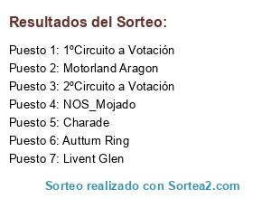 Lista de participantes: Auttum Ring, NOS_Mojado, Charade, Livent Glen, Motorland Aragon, 1ºCircuito a Votación, 2ºCircuito a Votación.