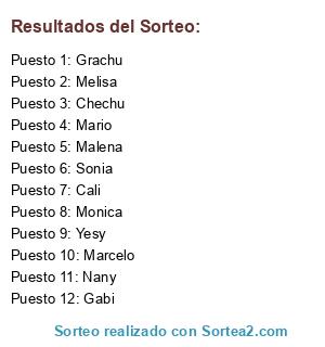 Lista de participantes: Melisa, Malena, Cali, Sonia, Chechu, Nany, Yesy, Marcelo, Monica, Gabi, Grachu, Mario.