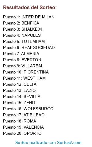 Lista de participantes: ZENIT, VALENCIA, WOLFSBURGO, SEVILLA, CELTA, TOTEMHAM, VILLAREAL, ROMA, LAZIO, INTER DE MILAN, BENFICA, ALMERIA, OPORTO, EVERTON, NAPOLES, AT BILBAO, FIORENTINA, REAL SOCIEDAD, WEST HAM, SHALKE04.