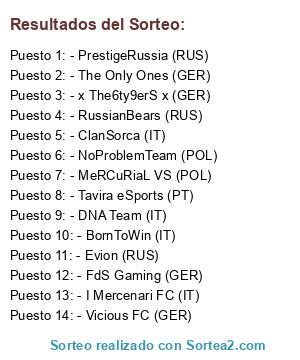 Lista de participantes: - ClanSorca (IT), - BornToWin (IT), - DNA Team (IT), - I Mercenari FC (IT), - FdS Gaming (GER), - The Only Ones (GER), - Vicious FC (GER), - x The6ty9erS x (GER), - RussianBears (RUS), - Evion (RUS), - PrestigeRussia (RUS), - MeRCuRiaL VS (POL), - NoProblemTeam (POL), - Tavira eSports (PT).