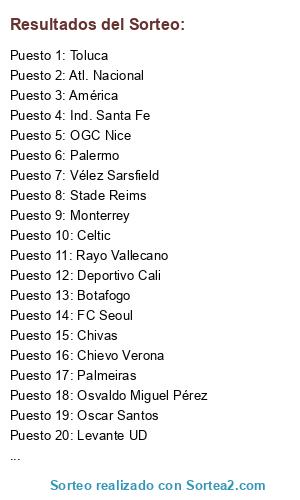 Lista de participantes: Livorno, América, Hertha BSC, Celtic, Martin Cazun, Villareal, Cruz Azul, Deportivo Cali, FC Twente, OGC Nice, FC Basel, KRC Genk, Werder Bremen, Palermo, León, RSC Anderlecht, Pumas, Corinthians, Toluca, Hull City, Osvaldo Miguel Pérez, RCD Espanyol, Atl. Nacional, Standard Llége, Stade Reims, Botafogo, Santos (Brasil), Palmeiras, Tigres, Toulouse, Bordeaux, AZ, Monterrey, Rayo Vallecano, Santos (MX), FC Seoul, Hellas Verona, Chivas, Ind. Santa Fe, L. A. Galaxy, Tijuana, Chievo Verona, FSV Mainz 05, Oscar Santos, Vitesse, FC Nuremberg, Levante UD, Vélez Sarsfield.
