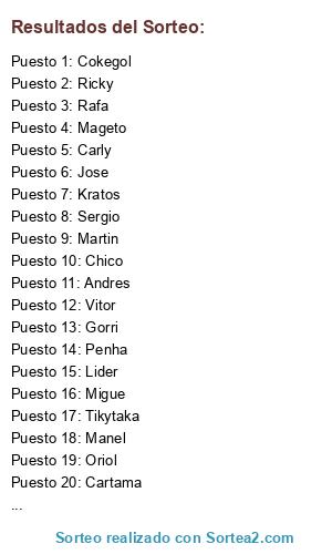 Lista de participantes: Cokegol, Migue, Ricky, Andres, Carly, Txito, Penha, Mageto, Manel, Gorri, Martin, Sergio, Oriol, Lider, Jimenystelooy, Jose, Chico, Kratos, Tikytaka, Cartama, Colmenero, Rafa, Vitor, JoseNivaria.