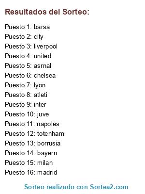 Lista de participantes: city, milan, madrid, barsa, asrnal, united, inter, juve, napoles, borrusia, totenham, atleti, lyon, liverpool, bayern, chelsea.