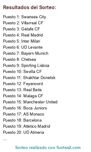 Lista de participantes: Malaga CF, Barcelona, Boca Juniors, Sporting Lisboa, Manchester City, UD Almeria, Real Betis, Juventus, Feyenoord, AS Monaco, Atletico Madrid, UD Levante, Villarreal CF, Sevilla CF, Chelsea, Napoles, Bayern Munich, Inter Milan, Real Madrid, Shakhtar Donetsk, Olympique Lyon, Swansea City, Manchester United, Getafe CF.
