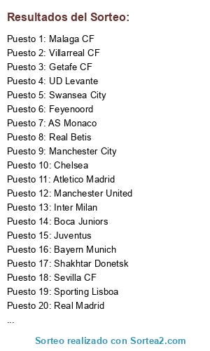 Lista de participantes: Malaga CF, Barcelona, Boca Juniors, Sporting Lisboa, Manchester City, UD Almeria, Real Betis, Juventus, Feyenoord, AS Monaco, Atletico Madrid, UD Levante, Villarreal CF, Sevilla CF, Chelsea, Napoles, Bayern Munich, Inter Milan, Real Madrid, Shakhtar Donetsk, Olympique Lyon, Swansea City, Manchester United, Getafe CF.