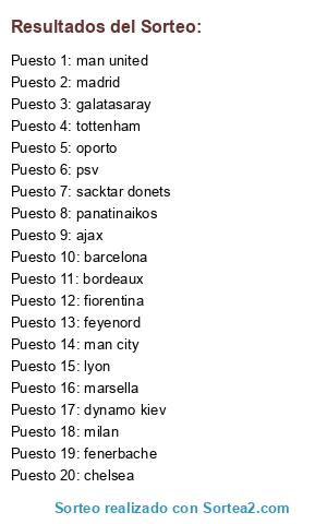 Lista de participantes: arsenal, chelsea, liverpool, man city, man united, tottenham, bordeaux, lyon, marsella, fiorentina, juventus, milan, ajax, psv, feyenord, barcelona, at madrid, madrid, valencia, panatinaikos, benfica , oporto, fenerbache, galatasaray, sacktar donets, dynamo kiev, boca juniros, river plate.