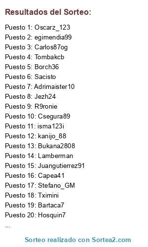 Lista de participantes: Dani10dr, Hosquin7, Juangutierrez91, Capea41, Adrimaister10, CRACK99, Pelizelli, PaRaNoSiS, Bartaca7, Csegura89, Marcalca, Jezh24, Euskdeivid, Bukana2808, Borch36, Sacisto, Lamberman, Zuinha, Trotters93, Stefano_GM, XThiagoSilva_, Tombakcb, Oscarz_123, Betito22, R9ronie, Arovira10, Carlos87og, Tximini, Adrian_mur, kanijo_88, isma123i, egimendia99.