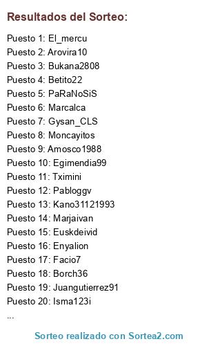 Lista de participantes: Euskdeivid, Isma123i, Hosquin7, Spain_Kiko, Juangutierrez91, Marcalca, Borch36, PaRaNoSiS, Moncayitos, R9ronie, Adrimaister10, Pelizelli, Pabloggv, Jorgena87, Kano31121993, Bukana2808, Enyalion, Arovira10, Tximini, Marjaivan, Betito22, Amosco1988, Pelito10, Gysan_CLS, Alr1979, Egimendia99, El_mercu, Nedaquits, Braveitor97, J_murcia, Facio7, Sacisto.
