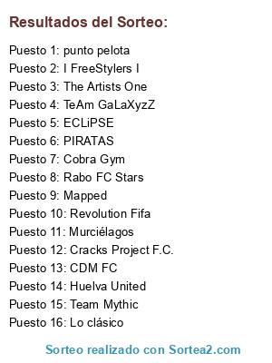 Lista de participantes: I FreeStylers I, Rabo FC Stars, Cobra Gym, Team Mythic, Revolution Fifa, Lo clásico, ECLiPSE, PIRATAS, TeAm GaLaXyzZ, CDM FC, The Artists One, Huelva United, Murciélagos, Cracks Project F.C., punto pelota, Mapped.