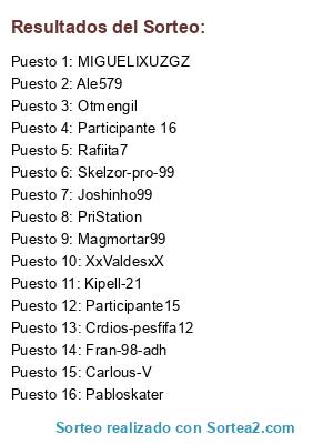 Lista de participantes: @XxValdesxX, @Joshinho99, @Fran-98-adh, @Otmengil, @MIGUELIXUZGZ, @Kipell-21, @Skelzor-pro-99, @PriStation, @Crdios-Pesfifa12, @Ale579, @Pabloskater, @Carlous-V, @Rafiita7, @Magmortar99, @Davidinho10, @Tontokienloleah.
