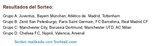 Lista de participantes: FC Barcelona, Real Madrid CF, Atlético de Madrid, Valencia, Chelsea FC, Manchester UTD, Manchester City, Arsenal, Tottenham, Paris Saint Germain, Borussia Dortmund, Bayern München, Juventus, Napoli, AC Milan, Zenit San Petesburgo.