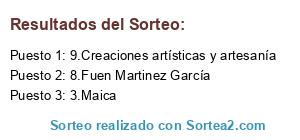 Lista de participantes: 1.Sarah Gibran, 2.Odina, 3.Maica, 4.Rox, 5.Anónimo, 6.Yolanda Llora Peiro, 7.Carol Vega Conde, 8.Fuen Martinez García, 9.Creaciones artísticas y artesanía, 10.Roxana Falasco, 11.Luz Agost, .