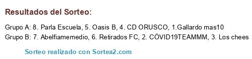 Lista de participantes: 1.Gallardo mas10, 2. CD ORUSCO, 3. La Torre ity, 4. CD Valdefierro, 5. CD AGULO, 6. MIL EURISTAS FC, 7. LaCasaPapel SAD, 8. Pilileisons.