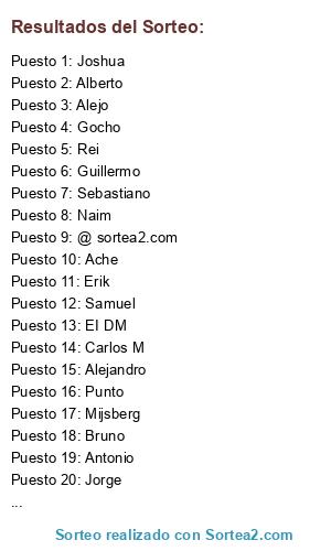 Lista de participantes: Angel, Punto, EI DM, Cedeno, Samuel, Carlos M, Naim, Erik, Osvaldo, Santiago, Maciel, Carlos F, Manuel, Asdrubal, Mijsberg, Alberto, Sebastiano, Antonio, Checho, Guillermo, Gocho, Bruno, AM, Rei, Alejandro, Ache, Joshua, Division, Alejo, Rocco, Gerson, Jorge, @ sortea2.com.