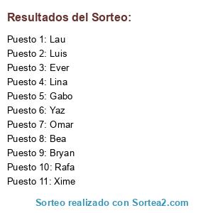 Lista de participantes: Bea , Bryan , Ever , Gabo , Lau , Lina , Luis , Omar , Rafa , Xime , Yaz , .