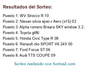 Lista de participantes: Toyota gt86, Audi TTS COUPE 09, Ford Focus ST 06, Honda Civic Type R 08, Renault clio SPORT V6 24V 00, Alpha romero Breara SKY window 3.2.