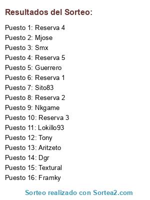 Lista de participantes: Dgr, Smx, Textural, Guerrero, Framky, Mjose, Sito83, Lokillo93, Nkgame, Tony, Aritzeto, Reserva 1, Reserva 2, Reserva 3, Reserva 4, Reserva 5.