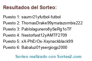 Lista de participantes: Pablolagunero8ySeRg1oTF, xX-PhErOx-Xxynackblack99, saumr21yfutbol-futbol, ThomasDrake99ymatazombis222, Nestorfast12yAMTF2709, Babaluz01ysergiogp2000.
