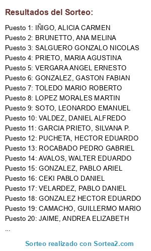 Lista de participantes: ABELDAÑO, JOSE FERNANDO, ABREGU MARIO DANIEL, ABREGU, SAMUEL OSVALDO, ACEVEDO CINTIA, ACEVEDO, DIEGO RAUL, ACEVEDO, JUAN AUGUSTO, ACOSTA, HUGO DARIO, ACOSTA, VICTOR GABRIEL, AGÜERO, NESTOR JOSÉ FRANCISCO, AGUILERA, CARLOS ENRIQUE, AGUIRRE MAURO DANIEL, ALARCON ROGELIO DANIEL, ALBARRACIN, NICOLAS, ALBORNOZ FERNANDO VICENTE, ALBORNOZ, ANDREA ROXANA, ALTAMIRANO JUAN GABRIEL, ALTAMIRANO, GUSTAVO, ALVES, ROSENDO MANUEL, AMERI EXEQUIEL NICOLAS, ANTELO, ENZO NICOLAS, ARAMAYO ALBERTO ARGENTINO, ARANDA, WILSON DAMIAN, AREVALO DANIEL MARCELO, ARGANARAZ WALTER FABIAN, ARGAÑARAS, CARLOS MATIAS, ARMAS, MARA DEL ROSARIO, AUAD HERNANDEZ, CHRISTIAN, AVALOS, VICTOR RAMON, AVALOS, WALTER EDUARDO, BARRETO ANGEL DANIEL, BOGARIN JOHANA, BOGGIATTO, SOLANA MARIA, BORQUEZ CESAR ENRIQUE, BOSÑAK, SERGIO HERNAN, BRAVO, EZEQUIEL MAXIMILIANO, BRUNETTO, ANA MELINA, BURGOS SANTIAGO MIGUEL, CABEZA HERNAN ANDRES, CACERES JUAN OSVALDO, CAMACHO, GUILLERMO MARIO, CAMPOS, IVAN EZEQUIEL, CANUTO FRANCISCO ISIDRO, CARMONA, PABLO MANUEL, CARRAZANA LUIS ALBERTO, CASARINI, DIEGO HERNAN, CASTRESANA ANA VICTORIA, CEKI PABLO DANIEL, CISTERNA, RAUL ANTONIO, CONTRERAS JUAN PABLO, COOK, CRISTIAN FERNANDO, CORBALAN, CHRISTIAN MANUEL, CORDOBA, NORMA BEATRIZ, CORRALES, GASTON ALEJANDRO, CUELLO, JOSE ADOLFO, D'ARTERIO HUMBERTO, DEBRIN GUSTAVO ANIBAL, DECIMA, FACUNDO EXEQUIEL, DELANI SALVADOR JOSE, DELANI, MAIRA BEATRIZ, DELGADO PONCE,LUCAS, DIAZ DAIAN PABLO, DIAZ FRANCISCO RAMON, DIAZ MARIO ALBERTO, DIAZ RENGANESCHI, EZEQUIEL, DIAZ, GONZALO ANGEL, DIAZ, GONZALO ISAIAS, DIAZ, MATIAS RENE, DIFARCO MARTIN ALEXIS, ESCALADA, CARLOS IVAN, ESCUDERO REMO ALEJANDRO, ESPINOZA, HORACIO DANIEL, ESTRADA FRANCISCO HECTOR, FERES JUAN RUBEN, FERNANDEZ DIAZ, MARIA LAURA, FERREYRA RAMON NORBERTO, FIGUEROA, MARCOS FEDERICO, FLORES LUNA, FACUNDO, FLORES, LUIS ALEJANDRO, FRIAS, RENEE DE LOS ANGELES, FUENZALIDA ACUÑA, ANABEL, GALARZA PABLO RICARDO, GALARZA, CLAUDIO OMAR, GALVAN, MARIA FERNANDA, GALVEZ DIAZ VERONICA ISABEL, GARCIA FERNANDO DARIO, GARCIA IBARRA, JOSE MARIA, GARCIA MARTINEZ GONZALO, GARCIA PRIETO, SILVANA P., GARCIA WALTER ANTONIO, GARCIA, HUGO ALEJANDRO, GIMENEZ LUIS MIGUEL, GOMEZ, MATIAS ALEJANDRO, GONZALEZ HECTOR EDUARDO, GONZALEZ, GASTON FABIAN, GONZALEZ, GRACIELA SUSANA, GONZALEZ, JUAN EMANUEL, GONZALEZ, LUIS ALBERTO, GONZALEZ, NAZARENO LUIS, GONZALEZ, PABLO ARIEL, GONZALEZ, PAULA LUCILA, GRADIN, LEANDRO ESTEBAN, GRIFFITLH, MARCELA ALEJANDRA, GUEDILLA, CESAR ISMAEL, GUINEA JORGE ADRIAN, GUZMAN, EDUARDO NICOLAS, HERBAS HECTOR LUIS, HERRERA, JOSE ANTONIO, IÑIGO, ALICIA CARMEN, ITUARTE MARIO ROQUE, JAIME, ANDREA ELIZABETH, JAIME, RICARDO RAUL, JALIL ROBERTO ALEXIS, JAVOSKY YESICA GISELA, JIMENEZ, CARINA DEL VALLE, JORGE PEDRO DANIEL, JUAREZ FABIO DANTE, JUAREZ LEONARDO GUILLERMO, LARA, EMANUEL AUGUSTO, LIZARRAGA, LUCAS BENJAMIN, LLANOS, LUCIANA ANCELMA, LOBO BRIAN ALEXIS, LOPEZ ABEL, LOPEZ FEDERICO EMMANUEL, LOPEZ MORALES MARTIN, LOPEZ, GABRIEL MAXIMILIANO, LOPEZ, LUIS EDUARDO, LUCENA, DANIEL ALEJANDRO, LUNA ANGEL EDGARDO, LUNA HUGO HERNAN, MACEDA PEDRO MANUEL, MAITA, CARLOS JAVIER, MAMANI ROBERTO MARTIN, MAMANI, ESTEBAN BERNARDO, MARIN SILVIA ALEJANDRA, MARTINEZ MIGUEL ALBERTO, MARTINEZ, LUIS RAFAEL, MASHMUT JOSE GABRIEL, MATURANO FLORES, ALEJANDRA, MEDINA MARIA ELENA, MEDINA PEREZ IGNACIO, MEDINA VICTOR AGUSTIN, MENENDEZ EDMUNDO A., MERCADO MANUEL HECTOR, MOLINA, DIEGO DAVID, MOLINA, MIGUEL ANGEL, MONASTERIO DAVID, MONTENEGRO, PATRICIO FRANCO, MORALES, DIEGO GREGORIO, MORENO, SANDRA ELIZABETH, MORINIGO, MARIELA PATRICIA, NAVARRO, ERASMO ALEJANDRO, NAVARRO, MARIANA CECILIA, NAZUR FRANCO NICOLAS, NIEVA JOSE LUIS, OCON,ABEL IVAN, OLEA, CRISTIAN EDUARDO, OLEA, FERNANDO EDGARDO, OLMOS,JOSE ANTONIO, ORELLANA JOSE LUIS, ORTIZ ANDRES RENE, PAEZ, IVAN EZEQUIEL, PALOMINO CARLOS NAHUEL, PARRADO, CARLOS JOSE, PAZ LUIS MARCELO, PELLASIO PIREZ HECTOR G., PEREIRA, DIEGO SEBASTIAN, PEREZ, PABLO SALVADOR, PIAZZA BLANCO LEANDRO NICOLAS, PICCINETTI, CINTHYA CAROLINA, PINTOS FUSTEGUERAS, ELMA V., POLITO PABLO AGUSTIN, POMO, FRANCO DE JESÚS, PRIETO, MARIA AGUSTINA, PUCHETA, HECTOR EDUARDO, QUINTANA SILVIA EUGENIA, QUIÑONE, CHRISTIAN ALEJANDRO, QUIROGA SERGIO FACUNDO, QUIROZ HUGO ORLANDO, RAMIREZ LELIA NOEMI, RAVAZA CARLOS DANTE, REINOSO STELLA MARIS, REQUISFORT, FRANCO, REYES, JUAN DOMINGO, REYNOSO DANTE ARTURO, ROBERTI QUEVEDO, FERNANDO, ROBLES, MIGUEL ANGEL, ROCABADO PEDRO GABRIEL, ROCHA, ANALIA VANESSA, RODRIGUEZ ALONSO AGUSTIN, RODRIGUEZ RICARDO R., ROIG, JOSE IGNACIO, ROJAS, MARTIN ALFREDO, ROJAS, MAYRA SABRINA, ROMANO, ANTONELLA, ROMANO, MARIO TOMAS, ROMERO, IVAN ALEJANDRO, RUIZ JOSE MARIA, SAIFE, JORGELINA DEL VALLE, SALGUERO GONZALO NICOLAS, SALIM YANINA SOLEDAD, SALINAS ROBERTO ARTURO, SALINAS, GUSTAVO JAVIER, SANCHEZ DE CISNEROS ANA M., SANCHEZ, CAROLINA MARÍA, SANCHEZ, LEANDRO SEBASTIAN, SANDOVAL, SERGIO OSVALDO, SANGUEDOLCE IVANA VANESA, SANTILLAN PEDRO JOSE, SANTUCHO CAROLINA, JOHANA, SIRIANI, EMILIO ESTEBAN, SORAIRE, MAXIMILIANO RAMON, SORIA DIEGO OSVALDO, SORIA OLMOS WALTER S., SOSA ELIANA LORENA, SOSA ROGER, SOTO, LEONARDO EMANUEL, SUAREZ WALTER ALFREDO, SUMBAY, YAMIL DANTE, TOLABA, LUCAS IVAN ARIEL, TOLEDO MARIO ROBERTO, TORRES ZUÑIGA ROBERTO A., TOSCANO CRISTIAN CARLOS, TREJO, SILVIA SUSANA, VALDEZ CRISTIAN ALBERTO, VALDEZ, DANIEL ALFREDO, VALDEZ, MARCOS LUCIANO, VALLEJO,JUAN PABLO, VALLEJOS, JORGE ANIBAL, VALLEJOS, LEONARDO MARCOS, VARELA MARTIN ALEJANDRO, VARELA, PATRICIA MABEL, VEGA GONZALO EMANUEL, VEGA MAXIMILIANO, VELARDEZ, PABLO DANIEL, VELASCO, HECTOR LUIS, VERGARA ANGEL ERNESTO, VIDES, DANIEL GERARDO, VILLAGRA, GUILLERMO, VILLEGAS ARIEL AUGUSTO, VISCIDO CRISTIAN FRANCISCO, VISUARA, ANGELICA MERCEDES, YUNEZ, NADIA YAMILE, ZAZARINI, ROBERT, ZELARAYAN, RODRIGO DAMIAN, ZERDA, JOSE GABRIEL, ZIGARAN, FRANCO MAXIMILIANO.