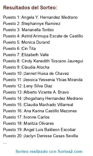 Lista de participantes: Sumil Jihuallanca, Caroline Tornero, Kyomi Natalia Gibu, Victor Eduardo Villafuerte Robles, Saul Aguirre, Johana Pilar Valdivia Rimachi, Veronica Lucchini, Ysa Urquizo(2 participaciones), Sofi De los Angeles, Jhogahany Hernandez Medrano, Pamela Galiano, Claudia Machado Villarreal, Myriam Sg, Alberto Vicente A. Bravo, Maritza Olivares, Cin Tita, Kary Guadalupe Mesía Tirado, Flor Pajuelo, Consuelo Vargas, Claudia Atocha, Martha Chuchon, Flor Juliana Elias, Jennifer Sofia Prado Caballero, Vanessa Condor, Elizabeth Salazar, Nany Medina Tinedo, Cecitar Salas, Leny Silva Diaz, Angel Luis Baldeon Escobar, Stephanie Prado Caballero, Karen Guisella Cruz Diaz, Rosa Perez, Astrid Arimuya Escate de Castillo, Gianina Virhuez(3 participaciones), Monica Durand(16 participaciones), Katherine Manay, Ivonne Carlos(2 participaciones), Leslie Madime, Liz Katheryn, Jessica Delgado, Lesli Cornejo, Judith Cayetano Rivera, Vanessa Iris(3 participaciones), Ali SG, Stephannye Ramirez, Lucero Rios Flores, Lidia Clemente Quispe, Claudia MiliClau Almengor Yllanes, Jessica Yessenia Ybias Miranda, Carlos Jhenko Antunez Antezana Rivera, Cecilia Torres, AJ Stefanie, Rebeca Neyra(2 participaciones), Jaclyn Denisse Casas Sevilla, Melisa Rodriguez, Milagros Maribel Sernaque Machare, Giovanna Sandoval de Pacitti, Wendy Valdiviezo Zevallos, Patricia Jesus, Elizabeth Valle, Sally Mont, Malu CM, Candy Arrieta H, Mayita Martinez Chiu, Maria Luz Pillaca Taco, Brenda Sandoval Viera, Jazmiin Verastegui Carlos, Ana Yisela Lopez Pardo, Jannet Huisa de Chavez, Ma Angelica, Kore Alhuay Aliaga, Magaly Quispe, Diana Yraola Hurtado, Jakelin Cristyn Sapacayo Aguilar, Paola Martinez Arteaga, Cindy Kenedith Toscano Jauregui, Perla de Díaz, Ana Karina Castillo Mezones, Claudia Cruzado Miranda, Gabriela Yesenia Suarez Sihua, Karinita Diaz, Lisset WG, Fiore Rocio B. P, Jimena Ramíres Montalván, Maria Viaña, Marianella Toribio, Carmen Garcia Sanchez, Angela Y. Hernandez Medrano(60 participaciones).