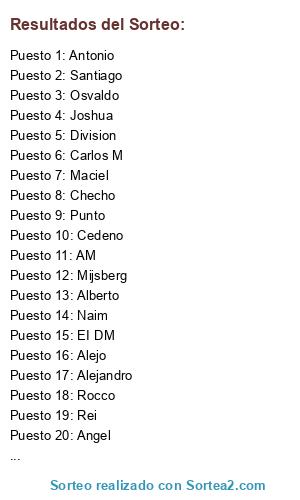 Lista de participantes: Angel, Punto, EI DM, Cedeno, Samuel, Carlos M, Naim, Erik, Osvaldo, Santiago, Maciel, Carlos F, Manuel, Asdrubal, Mijsberg, Alberto, Sebastiano, Antonio, Checho, Guillermo, Gocho, Bruno, AM, Rei, Alejandro, Ache, Joshua, Division, Alejo, Rocco, Gerson, Jorge.