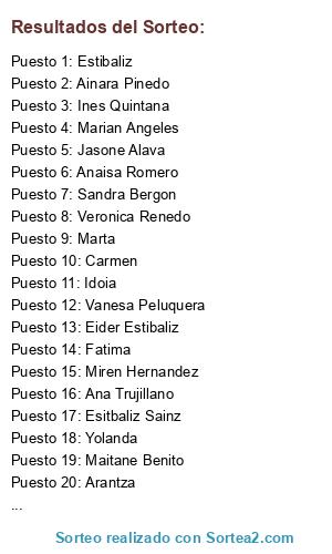 Lista de participantes: Leire Albizua, Mada, Nahia, Marta(3 participaciones), Eguz Sasiain, Leire Ibarrondo, Carmen, Begoña Alvarez, Fatima, Charo, Esperanza, Iratxe, Laura Ugalde, Miriam Eguia(2 participaciones), Asun, Ainara Pinedo(2 participaciones), Arantza, Marian Angeles, Ines, Maite, Chica Autopista, Josune(2 participaciones), Yolanda, Jasone, Izaskun Bengoa, Encina, Enma, Mercedes, Janire, Idoia, Marisol, Sabine, Erika, Eider Estibaliz, Vanesa Peluquera, Nerea, Conchi Garcia, Ines Quintana, Ana Trujillano, Maria Je Luyando, Onintze Guerra, Isabel Retamero, Estibaliz, Vanessa Ugalde San Roman, Inma Bilbao, Jasone Alava, Karmele Aldama, Ayae Nuñez, Yolanda Castellano, Mirax Mi Rax, Silvia Arribas(2 participaciones), Elsa BaMa, Miren Hernandez, Itxaso, Nerea Lopez, Esitbaliz Sainz, Itxaso Trujillano, Jone Zorroza, Ane Barrenengoa, Ainara Yarritu, Araceli- Vitoria, Marta Alvarez, Veronica Renedo, Yoli Llano, Yoli Iglesias, Sandra Bergon, Yolanda Moreno, Maialen Gonzalez, Yolanda Retornano, Maitane Benito, Maite Eguia, AB Peluqueria, Josune Arteaga, Anaisa Romero, Izaskun Fanarraga, Marta Burutxaga, Laura Rodriguez, Aikelly Iznaga, Nekane Hernandez, Marina Luyando, Yoana Gardeazabal, Cristina Sanchez, Lorena Arroyo, Jessi Larroyo, Soleil Salu, Inma (Luyando), Antzone (Ines), Slipper motas.