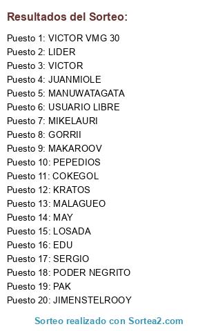 Lista de participantes: COKEGOL, EDU, GORRII, JIMENSTELROOY, MIKELAURI, PEPEDIOS, MAY, LOSADA, KRATOS, LIDER, PODER NEGRITO, MANUWATAGATA, MAKAROOV, JUANMIOLE, MALAGUEO, VICTOR VMG 30, VICTOR, PAK, SERGIO, USUARIO LIBRE.