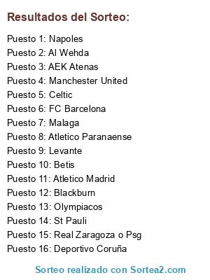 Lista de participantes: Olympiacos, Napoles, Atletico Paranaense, Malaga, Betis, Manchester United, Levante, Celtic, FC Barcelona, St Pauli, Blackburn, Real Zaragoza o Psg, AEK Atenas, Al Wehda, Atletico Madrid, Deportivo Coruña.