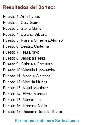 Lista de participantes: Jéssica Daniela Reina, Angela Cisterna, Beatriz Cisterna, Gabriela Corvalan, NoeNu Nuñez, Jessica Perez, Ivanna Gimenez Alonso, Natalia Lipovetzky, Romina Nieto, Hebe Mamani, Daiana Silvana, Ana Hynes, Naoko Lin, Ceci Ganem, Stella Maris, Telu Bravo, Katrii Martinez.